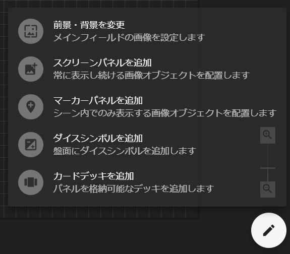 | 7 | 編集一覧 | 「前景・背景の変更」「マーカーパネル」等盤面に追加したい場合、ここをクリックするとウィンドウがでてきます |