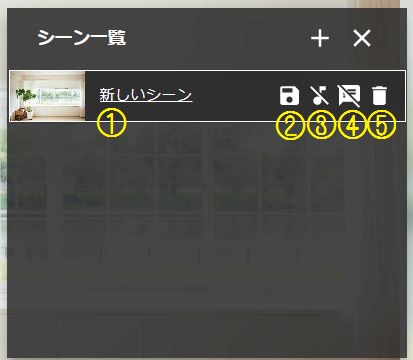 | 1 | シーン名 | シーン名をクリックすると右の画像が出てきます シーンタイトルを変えると「新しいシーン」が「シーンタイトル」の内容に変更されます 切り替えメッセージは、場面を切り替えした際にテキストがルームチャットに表示されます |