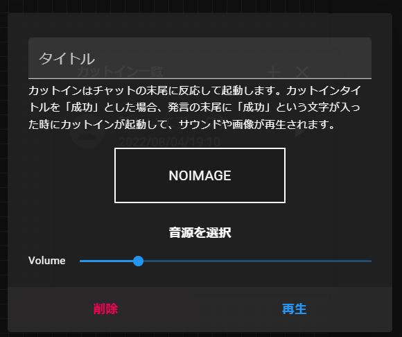 「音源を選択」をクリックすると音源の選択画面になり、設定するとカットインが反応するタイミングで音声を流せます