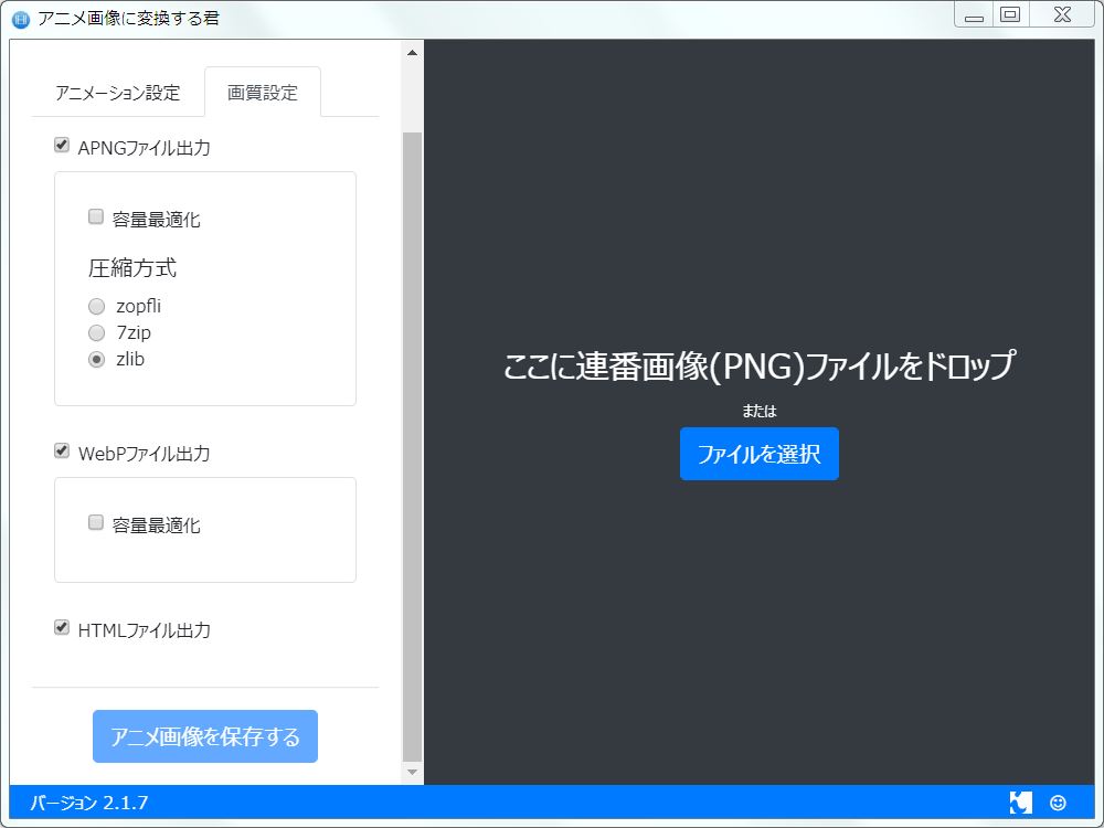 「容量の最適化」については、画質を下げることで容量を小さくしてくれる機能なのでお好みで設定してください(今までに解説で使用しているapng画像は全て最適化しています。画質を下げると言っても結構きれいに下げてくれるので、容量が気になる場合はチェックを付けるのを推奨します)